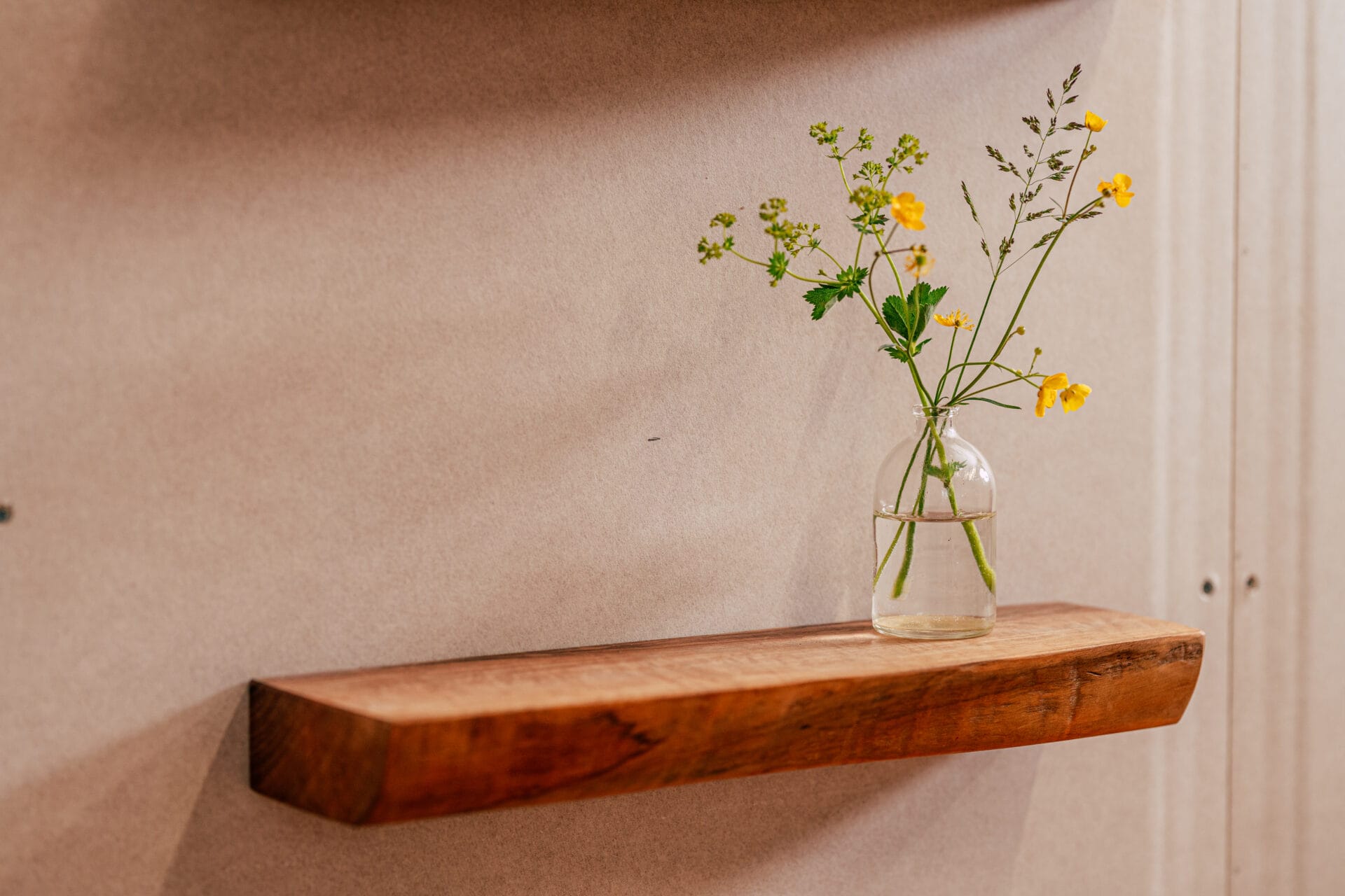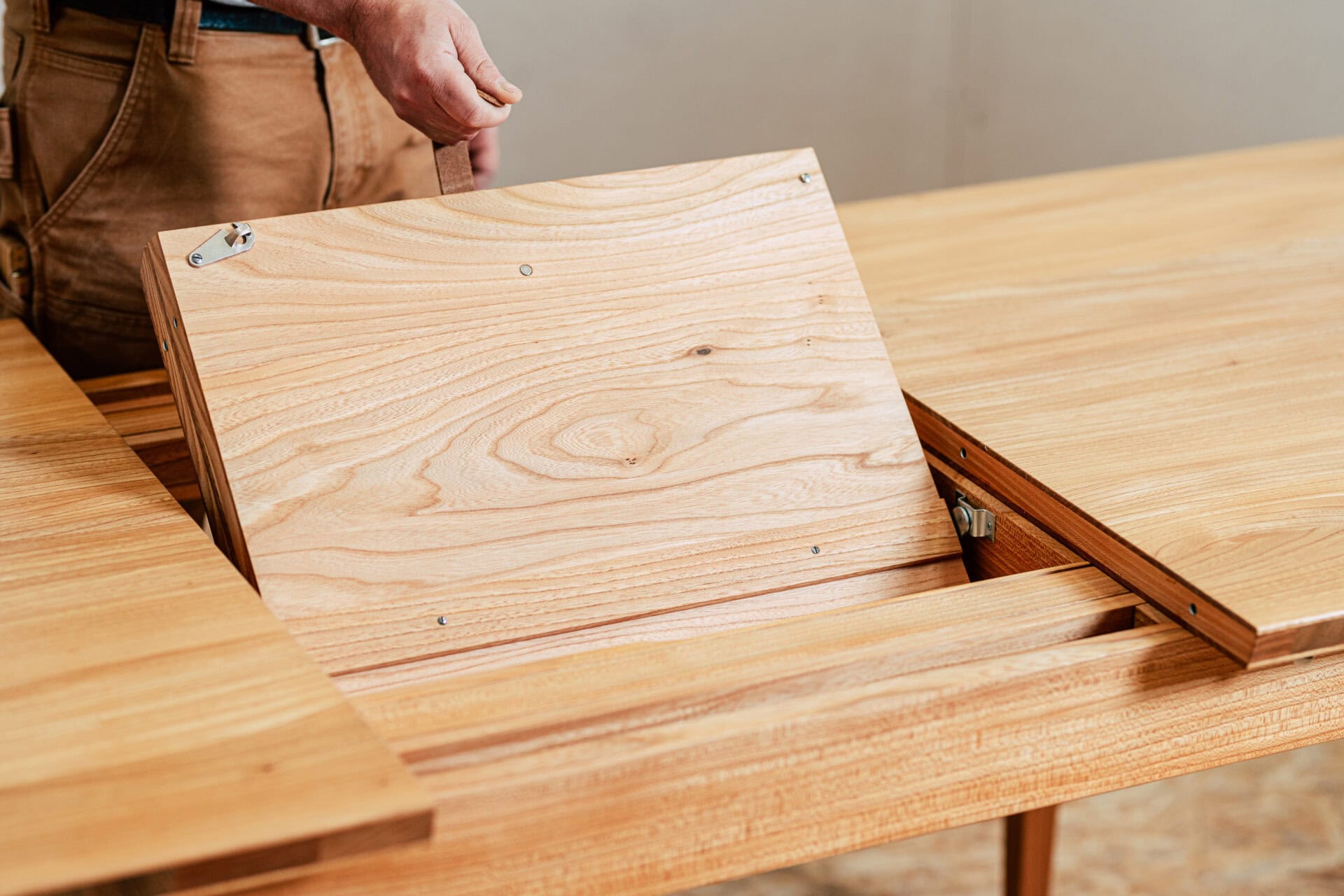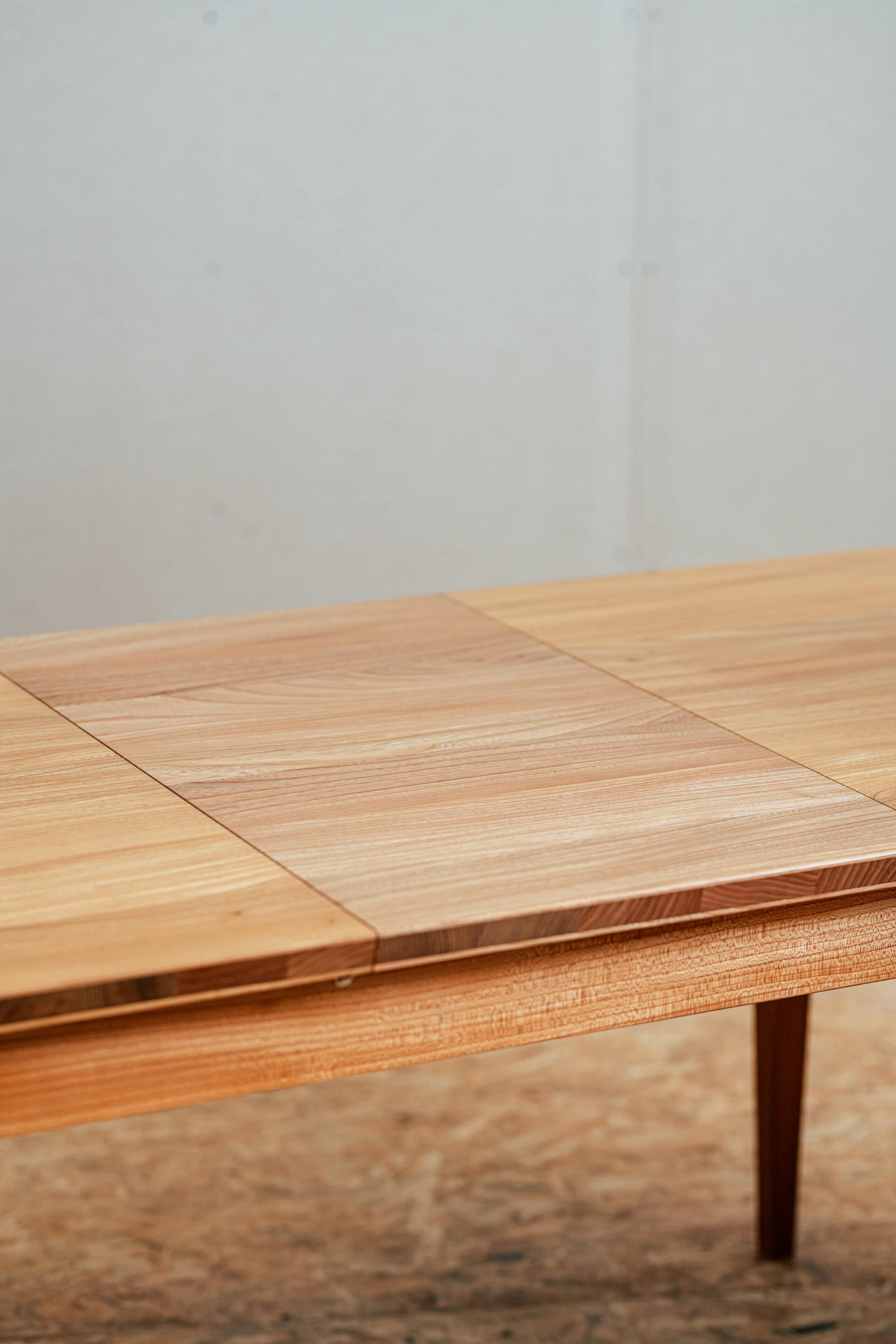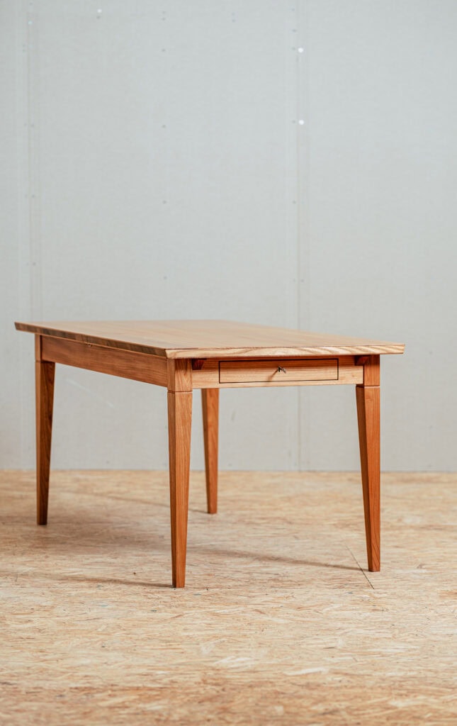 Pöytä on valmistettu 100-prosenttisesti massiivipuusta. Yksilöllinen kolmikerroslevy jalavasta, massiivisessa kehikossa oleva laatikko yhtenäisellä puunsyillä sekä massiivipuinen liukumekanismi – nämä yksityiskohdat tekevät pöydästä ainutlaatuisen.