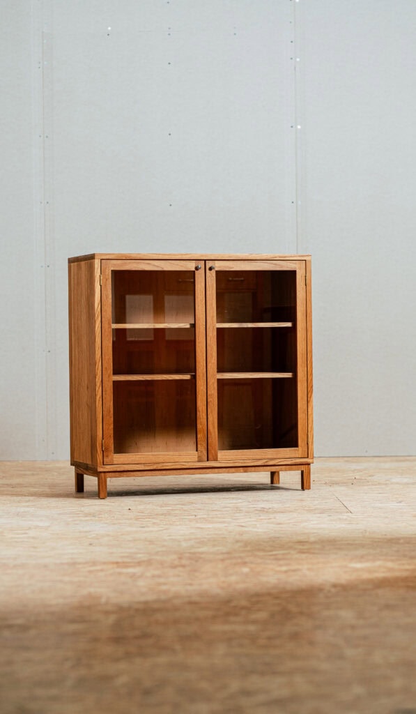 TAMMINEN KIRJAVITRIINI.Materiaali: Baijerilainen tammi, lasiToiminto: Suunniteltu kenkäkaapiksi, käytössä kirjavitriniinä.Kapeat kehysovet ja sirot, yksinkertaiset jalat antavat kaapille sen yksilöllisen ilmeen – yksinkertaisuus tekee siitä ainutlaatuisen.